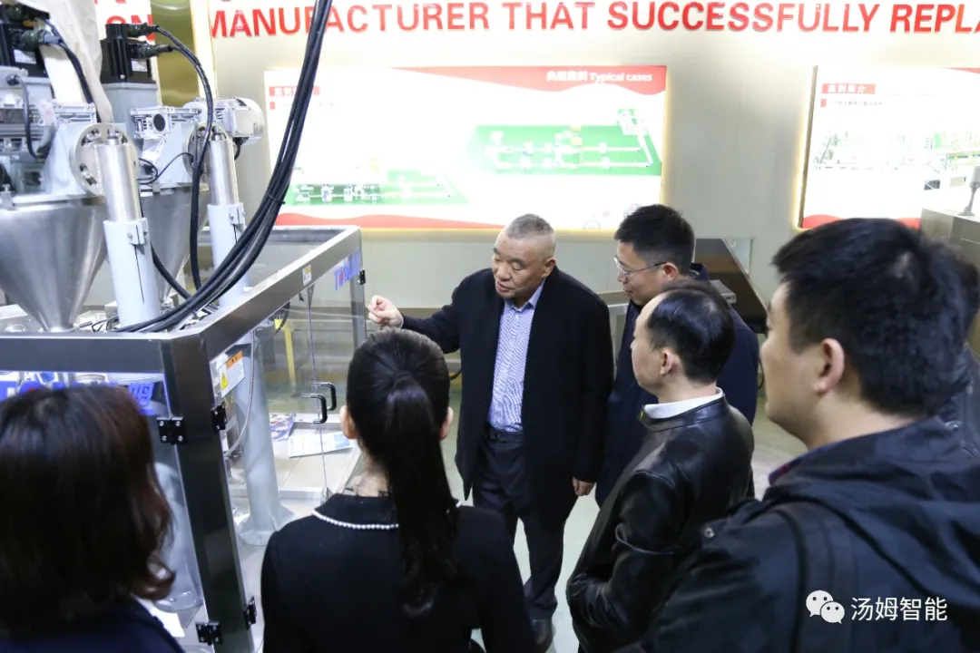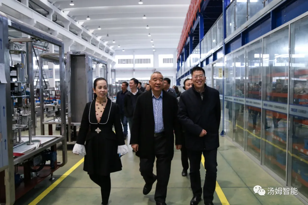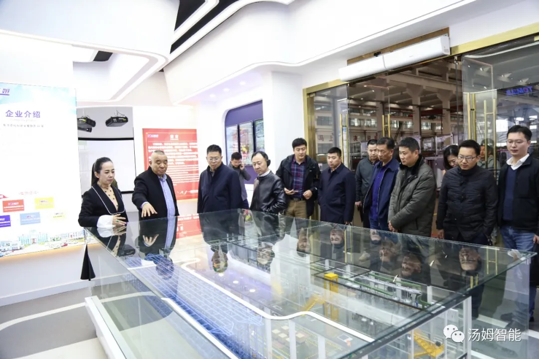在江蘇湯姆集團董事長湯建華,湯姆森總經理王芳,集團財務總監吳芳的陪同下,陳區長一行參觀了湯姆集團的科技展覽館、重點參觀了專利墻和榮譽墻,以及湯姆集團的樣板車間和一期二期100畝生產基地。董事長湯建華向陳區長介紹了湯姆集團的發展,重點闡述了在智能制造上面的科研、創新、以及在客戶現場的使用案例。